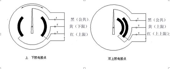 防爆電接點雙金屬溫度計配有電接觸裝置& mdash即機械電接點。當被測介質的溫度發生變化時,自由端的細軸和轉向傳動機構帶動指針和動觸頭轉動,指示刻度盤上的溫度變化值。當它與固定觸點(上限觸點和下限觸點)接觸或斷開時,電路系統中的繼電器和接觸器起作用,以達到自動控制和報警的目的。